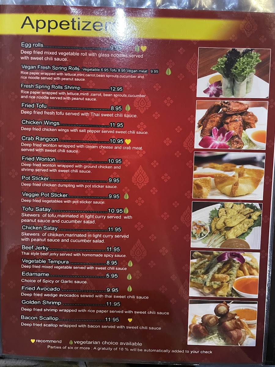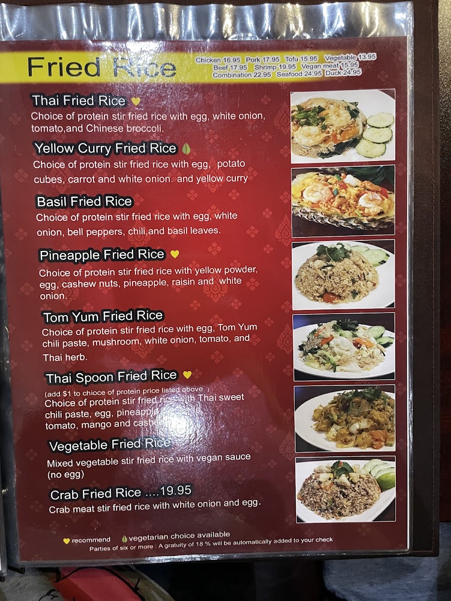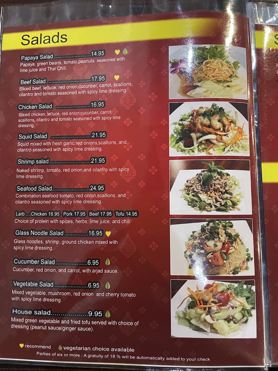 Thai Spoon specializes in a wide array of traditional Thai dishes, and their menu boasts a variety of options that cater to every palate. Start your culinary journey with the Beef Salad, a refreshing blend of sliced beef, crispy greens, and a zesty spicy lime dressing that'll tantalize your taste buds for just $17.95. Or opt for the Glass Noodle Salad, featuring shrimp, ground pork, and peanuts in a refreshing lime dressing for maximum flavor at $16.95.